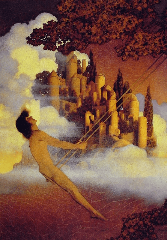 Admittedly, how I discovered Maxfield Parrish was by accident. I was at my grandparents’ house helping do some repairs and found myself in the basement. While down there, I was in my grandpa’s old workshop. I got curious of what was down there, and so I started rummaging around until I found a print of Parrish’s Daybreak leaning against the wall between a few other old paintings. As soon as I saw it, the work captivated. I pulled the print out between the other works of art and just took it all in. Despite its aged and dirtied state, the print still demanded my attention even after many years of collecting dust in my grandparents’ basement.